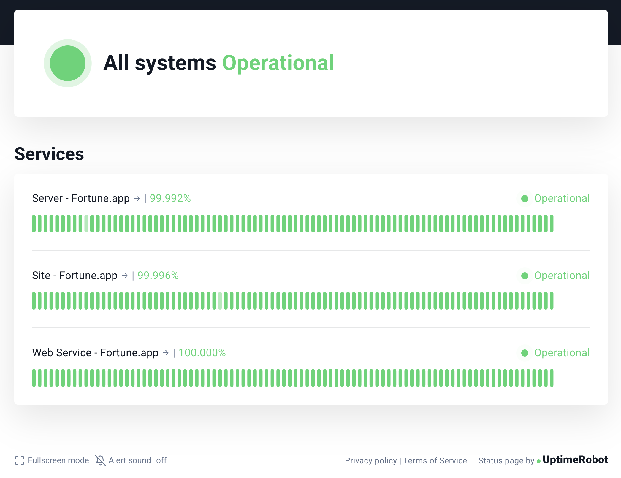 (This is a screenshot of the uptime dashboard of my SaaS, Fortune.app. It has been running for 365 days with 99.99% uptime. This shows public services only - internal services like Redis and databases have also maintained 100% uptime.)